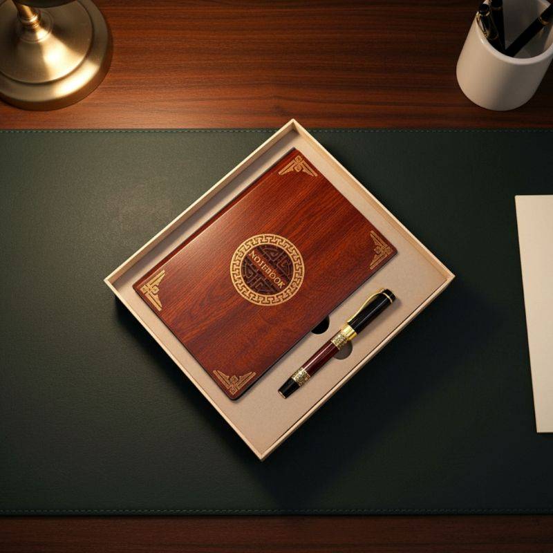 See esmaklassiline komplekt sisaldab puidust kaantega ja kuldsete äärtega märkmikku ja kvaliteetset pastapliiatsit.